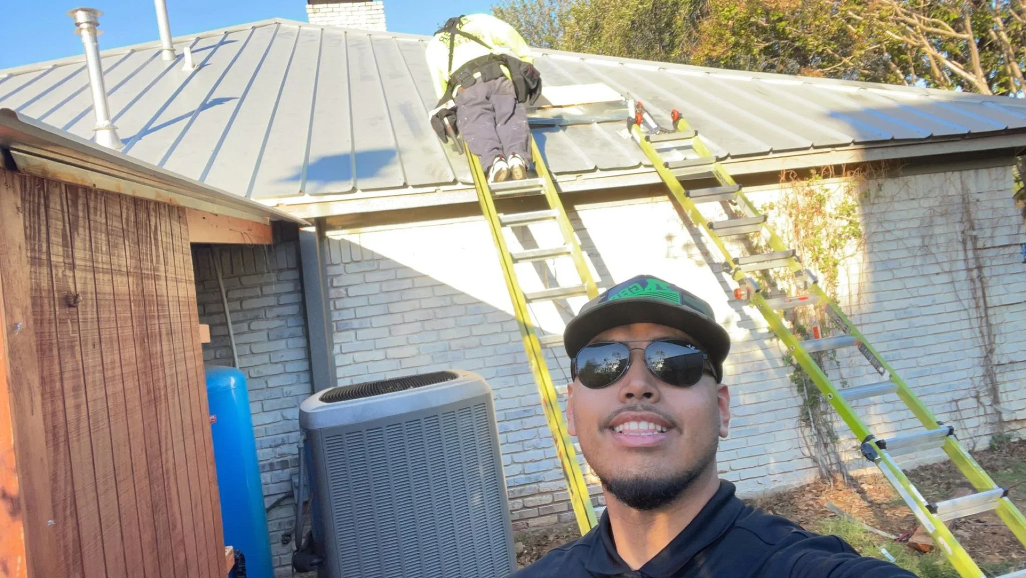 Modern suburban home with half its roof finished in classic asphalt shingles and the other half installed with sleek, standing seam metal roofing, showing the differences between traditional asphalt and metal roof systems for residential roofing needs.